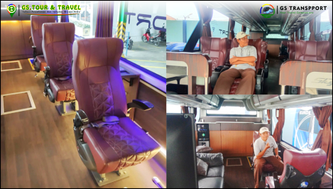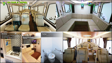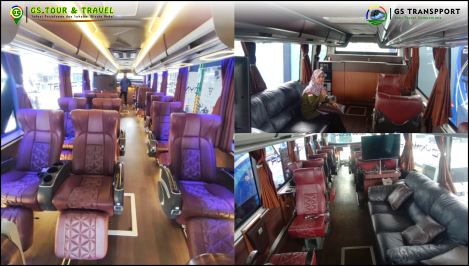 melakukan perjalanan dan berwisata bersama family tercinta, Bapak/Ibu/Kakang/Teteh/Sobat GS, special kami kami rekomendasikan bus frist class, kapasitas 18/21/23 tempat duduk dengan seat Lebih Luas, Leg Rest, Sofa, Pantry, toilet dll. type ini kami sebut layanan frist class